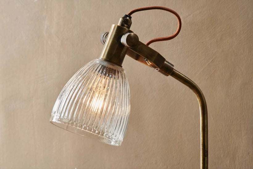 The ribbed glass shade of our Archii Table Lamp adds a lightness to this elegant, well designed, aged-brass table lamp.