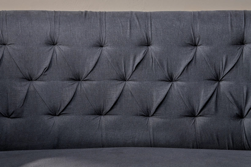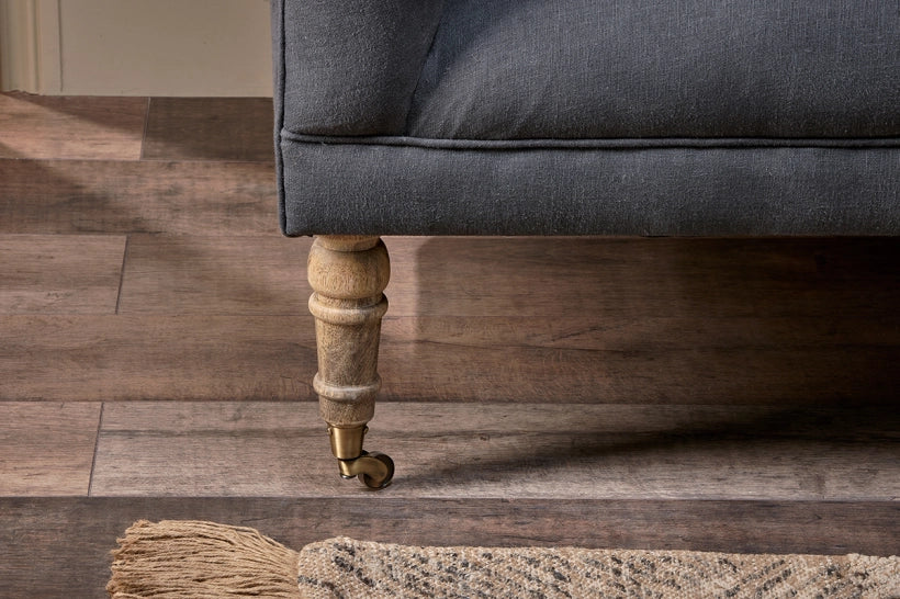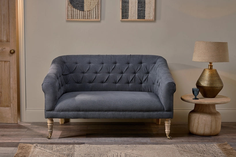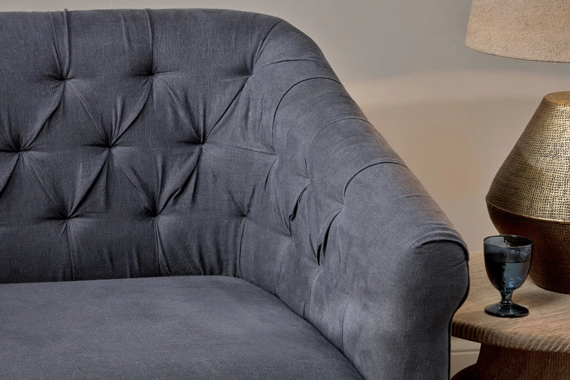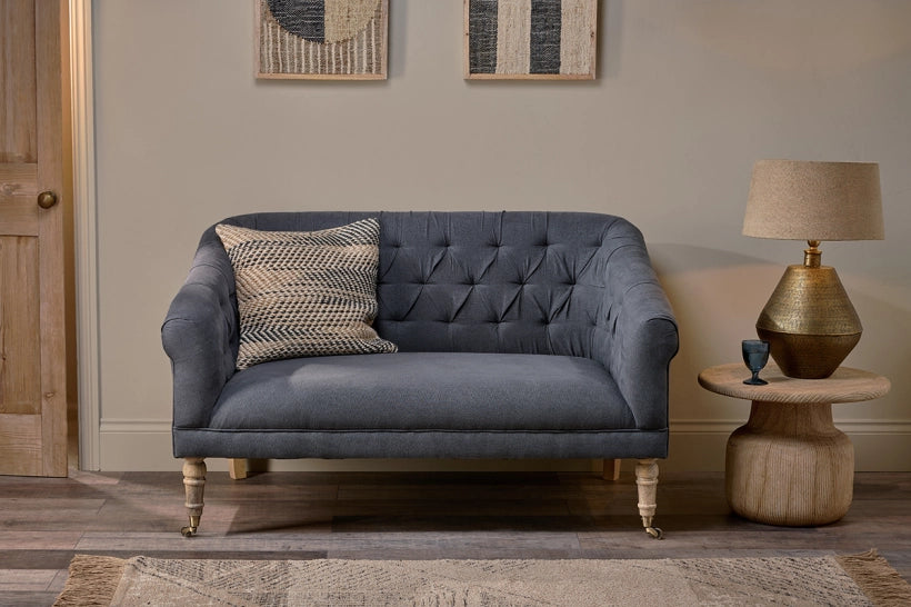 This elegantly upholstered sofa is perfectly proportioned for cosying up together or stretching out solo. The ideal size for a small space, it has a simple design with beautiful details that make it stand out from the crowd. Fully upholstered in our natural charcoal linen with button tucked detail on the back and stylish legs turned from sustainable mango wood, it’s a firm but comfortable piece that would work well in any room, including a kitchen or bedroom.