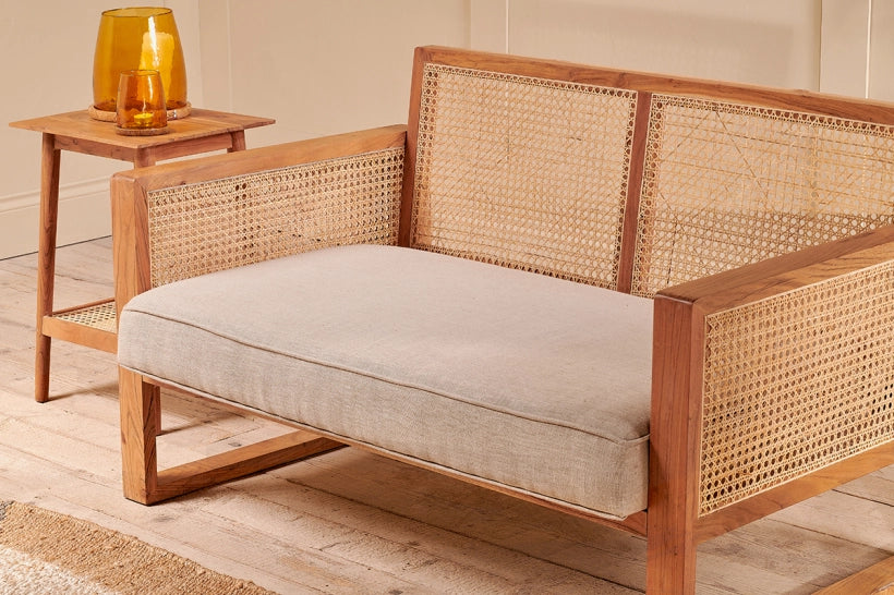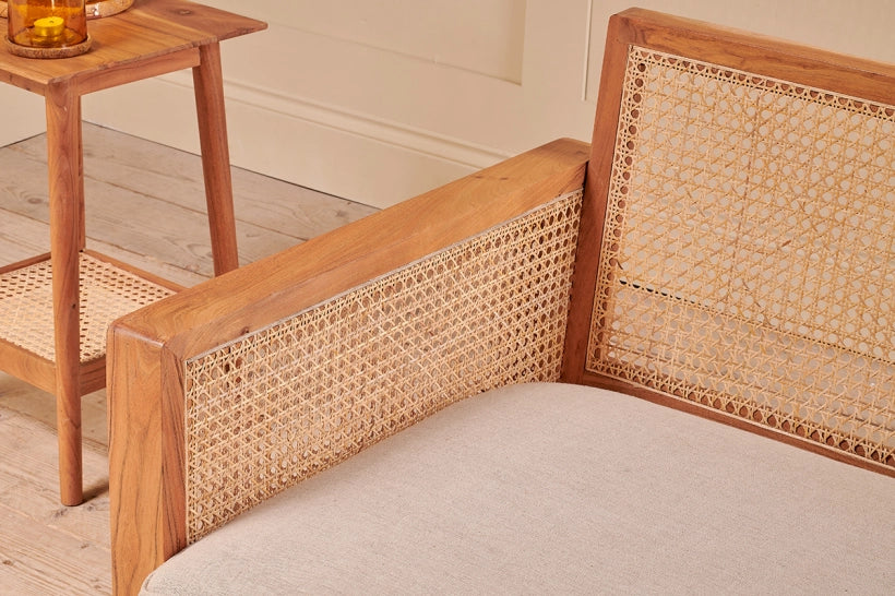 The Bangorang cane sofa has an appealing light, natural look. The frame is crafted from acacia wood, a warm wood that has an attractive patina. The cane work is skilfully woven by hand and covers the back and side arms of the sofa. The comfortable seat is upholstered in a natural linen fabric. These naturally eco friendly materials sit effortlessly in a living space and add a calming feel. Cane work is an age old skill that dates back centuries. It takes a patience and skill to achieve the attractive woven technique on display with our Bangorang sofa.