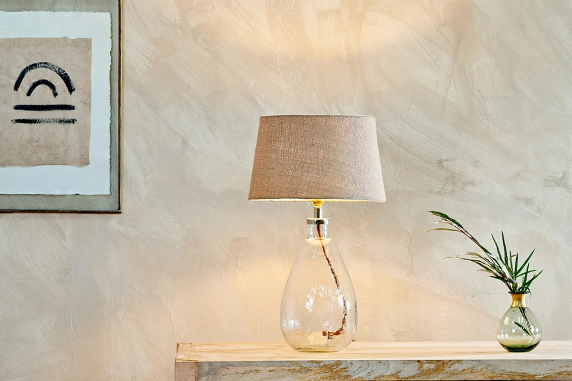 We think this elegant lamp base is divine. It is crafted from recycled glass by skilled artisans in Rajasthan. The hammered effect is created by hand when the glass is molten giving a beautiful textured and imperfect finish. Available in three colours.