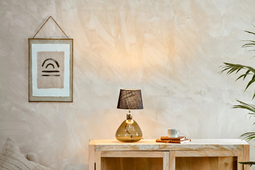 We think this elegant lamp base is divine. It is crafted from recycled glass by skilled artisans in Rajasthan. The hammered effect is created by hand when the glass is molten giving a beautiful textured and imperfect finish. Available in three colours.