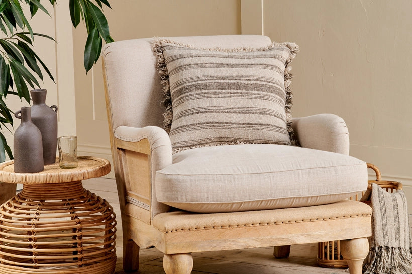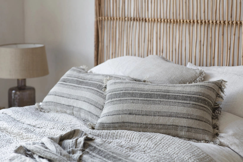 The tones of charcoal and natural form a subtle and attractive pattern in this Cirque linen cushion cover. The linen is pure, and this gives it an appealing slubby texture that feels relaxed and comfortable. The handwoven process used to weave this soft, striped cushion is evident in its texture and finish. The Cirque stripe works well as a scatter cushion, adding interest to a bedroom or living space. Linen is a breathable, long lasting material that is well suited to home furnishings. We love its organic unstructured aesthetic.