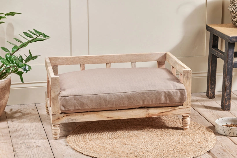 Our large Hark mango wood pet bed promises to keep your dog in the lap of luxury. We`ve taken care to make sure our pet beds are attractive pieces of furniture that will complement your existing interiors and provide a cosy retreat for your pet. The Hark’s mango wood frame and turned feet have an appealing natural patina. The raised bed is designed to prevent drafts and provide your dog with an elevated position. Complete the look with one of our handcrafted pet mattresses, designed to fit the Hark pet bed perfectly. Words of Wisdom: Our large pet bed is suitable for medium sized dogs, such as spaniels or Labradors. As with all our collections, we have carefully chosen our materials to ensure our pet range meets our eco credentials.
