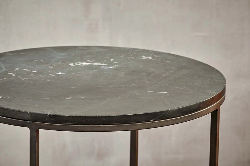 Our stylish Hiirage side table makes a stylish and versatile addition to an interior. The black marble top and lower shelf is crafted from solid marble. The natural marble varies from piece to piece providing each table with its own unique identity. The refined iron framework gives a striking edge and the lower section offers practical storage for magazines and books.