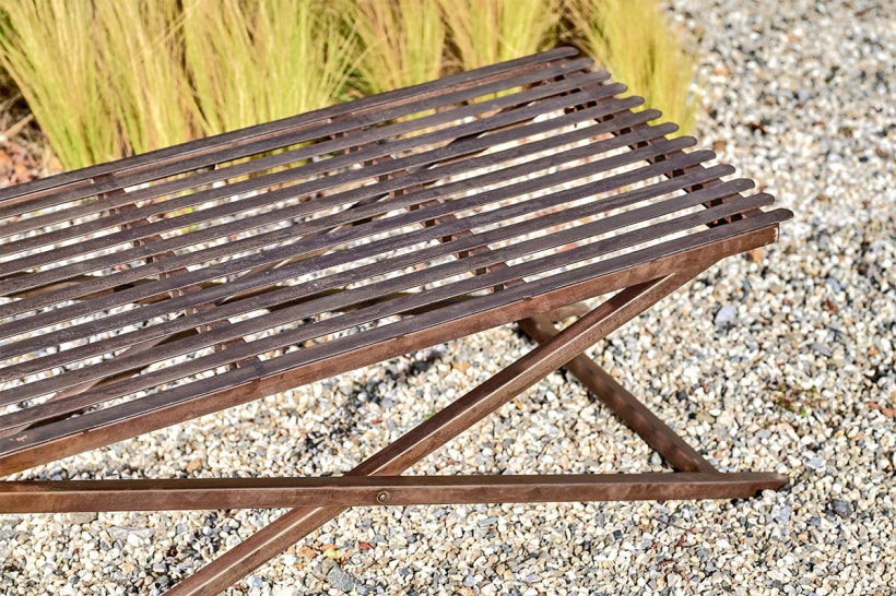 This stylish Icho coffee table is constructed from iron in an industrial slat design. The tables have a cross iron base that folds neatly away for simple storage. Display with other pieces from the Icho outdoor range.