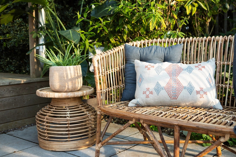 Our Inugaya rattan sofa makes a beautiful addition to garden rooms and conservatories. Handcrafted from rattan, the sofa has a natural mellow tone and a timeless quality that makes it feel light and summery. The rattan frame is crafted into shape using steam, before being joined with rawhide for added strength. Though the sofa does not come with its own cushion, we suggestion styling it with our soft Yardo cushions for a pared-back look.Words of Wisdom: Rubber stoppers are provided separately, should you wish to add these to the base of each foot to provide additional protection from wet ground and to avoid scratching any surfaces.