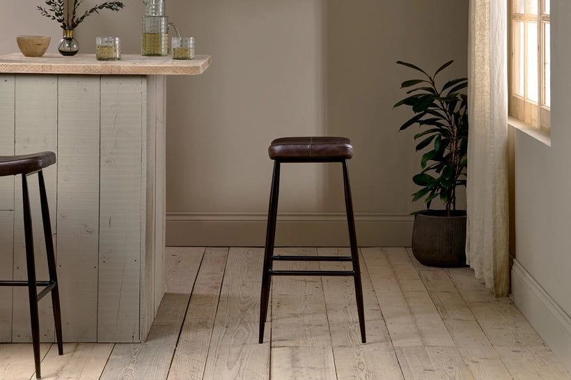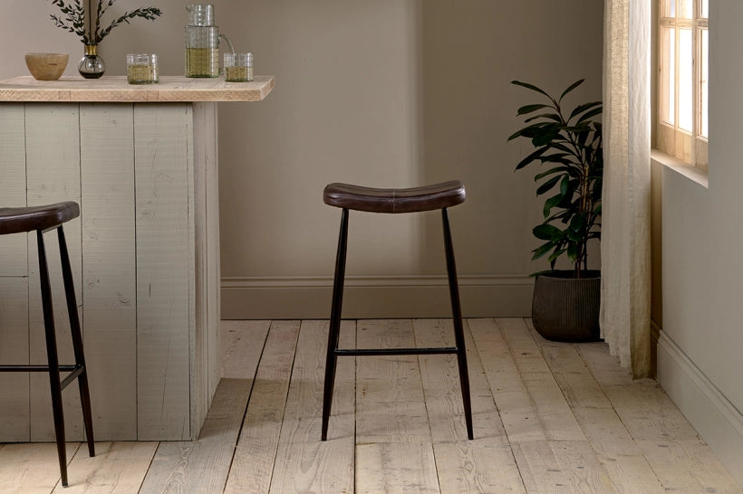 The simple yet sophisticated Jesse counter stool is upholstered in handmade dark brown buffalo leather with an ergonomic, curved seat and footrest for added comfort. The seat is finished with two simple symmetrical stitches, horizontally and vertically, while the simple frame is made from solid iron, bringing you a robust piece that will stand the test of time. The buffalo leather upholstery is a by-product and is dyed using vegetable extract and tree bark which means the leather colour will enrich further with time.