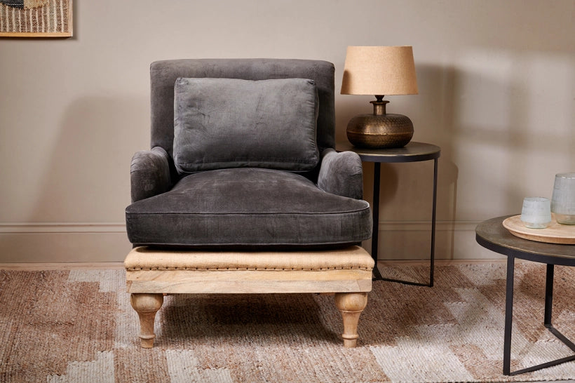 Generously proportioned, our Jube velvet armchair has a deep, sumptuous seat, upholstered in moss coloured, cotton velvet. The chair features a deconstructed design, incorporating natural wood and hemp. The high back and comfortable resting arms make this the perfect chair to relax into, where each armchair has a seperate velvet support cushion for additional comfort. Style in a living room with a side table and floor lamp.