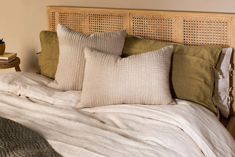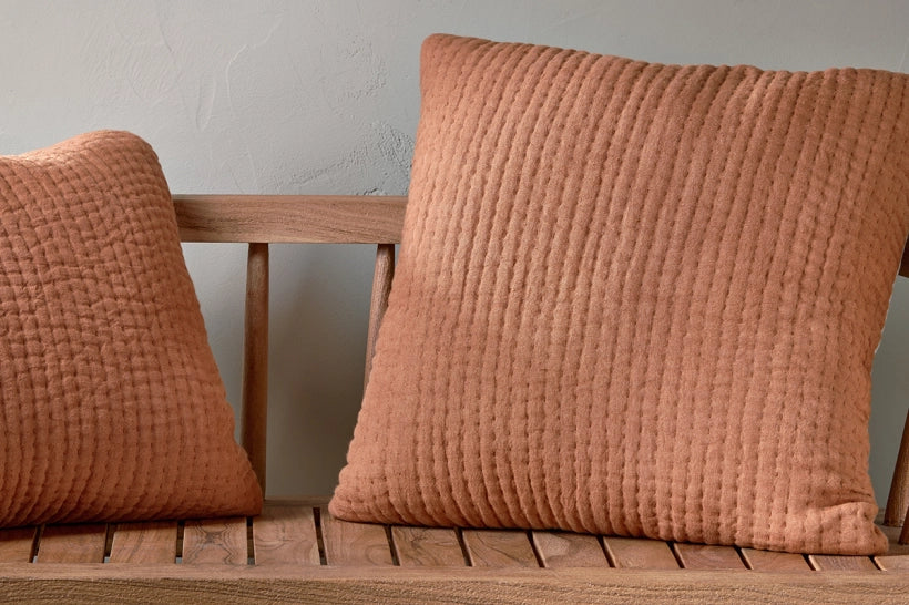 Our beautifully tactile Lilu cushion in warm rust adds a cosy and luxurious feel to your home. Crafted from linen with soft cotton wadding, it has an understated quilted pattern which enhances its tactile quality. Its rich earthy tones will boldly enhance an interior, while the use of linen makes it a sustainable choice. The cushion cover is finished with a beautiful kantha stitch, a traditional form of Asian embroidery associated with repurposed textiles. Style with the rest of the Lilu collection for a harmonious aesthetic. Please note, this is the outer cover only.