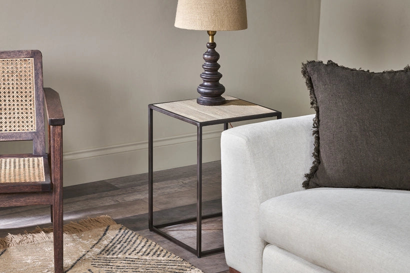Contemporary, clean lines define our square Matsu side table, with its sturdy iron frame in gun-metal grey and a mango-wood top in a dark walnut finish. The surface has been hand-grooved for an interesting reeded effect that adds texture to the piece. Practical and versatile, it`s a simple design and shape that pairs easily with an armchair and a table lamp to create a cosy reading spot in any nook or corner of the home. There is a matching coffee table in the collection.