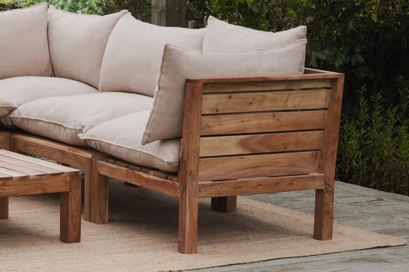 Made from acacia wood that we love for its warm natural tones and beautiful grain, our Mete collection of outdoor furniture is both hard-wearing and timelessly stylish. This simple, slatted design is part of a modular range that allows you to choose exactly what you need for your outdoor space and gives you increased flexibility when arranging your seating. This piece is designed to be positioned in the corner with adjoining pieces available separately, and comes with a base cushion and two back cushions, all of which are made from a water-repellent jute and cotton blend. Pair with the modular sofa extension or as a standalone piece. Please note, this collection also includes a coffee table.