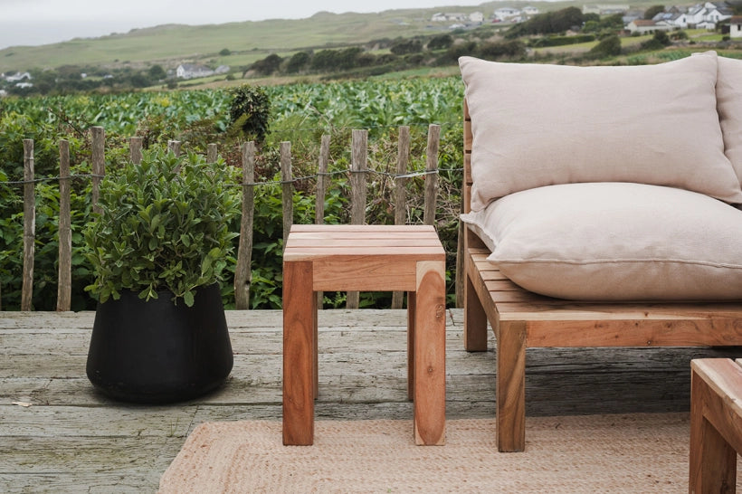 Made from acacia wood that we love for its warm natural tones and beautiful grain, our Mete range of outdoor furniture is both hard-wearing and timeless. This simple, slatted side table design is part of a modular range that allows you to choose exactly what you need for your outdoor space, giving you increased flexibility when arranging your set up. Pair with the modular corner sofa or sofa extension or simply as a standalone piece to go alongside existing outdoor furniture to rest drinks.