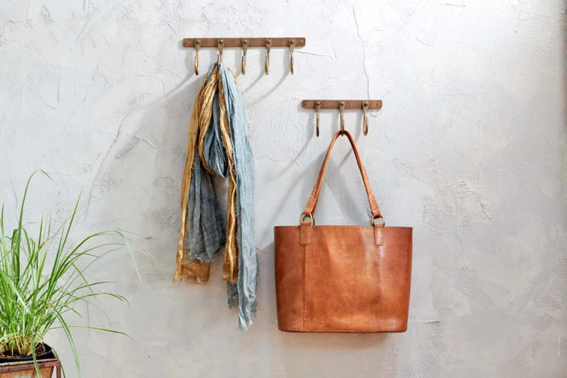These Neptune iron hooks have an antique brass patina. The elegant display is perfect for small storage items.
