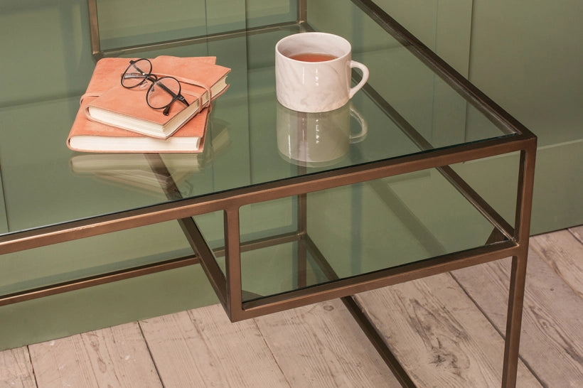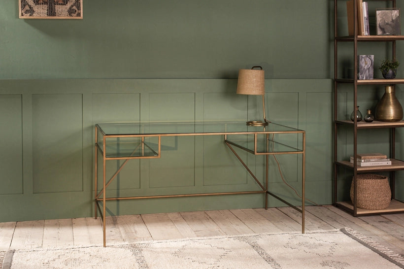 With its slimline brass frame and generous glass panels, our Nioi desk is both elegant and practical. Well-designed and robust, it makes a stylish addition to your study or bedroom. The brass adds warmth while the expanse of glass brings a contemporary feel. Its large surface area comfortably fits a laptop and other accessories. Two compartments make it easy to store your belongings while keeping the top of the desk clear. Style with a brass desk chair for a sophisticated aesthetic.