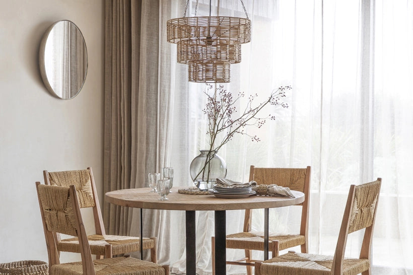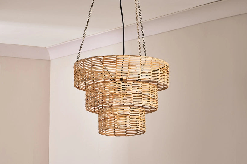 The Nono rattan chandelier is the perfect antidote to traditional elaborate chandeliers but is no less standout. Warm wicker has been skilfully woven into three attractive tiers to create a room-defining, statement light that retains a relaxed and natural feel. The varied and mellow hues of the chandelier marry beautifully with other neutral tones, making it a versatile piece. The intricate wicker work acts as an elegant filter for the light within, casting pretty shadows and adding to a harmonious mood.