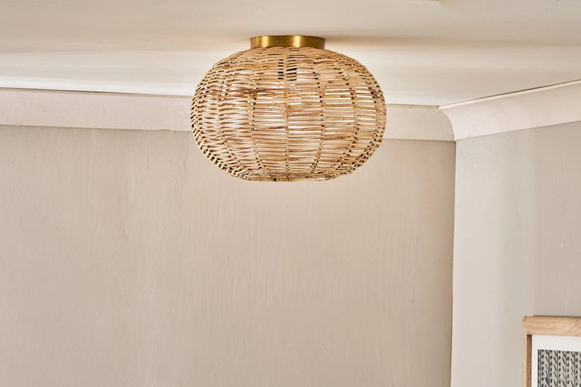 The Nono flush wicker light is perfectly designed for lower ceilings or more practical use along a landing or hallway. The wicker has an appealing natural tone, that feels calming and fresh. The globe shape is pleasantly curved and offers a soft profile. The wicker light screws neatly into the a ceiling fitting ensuring your living space has the benefit and appeal of a pendant light but in a more space efficient design.