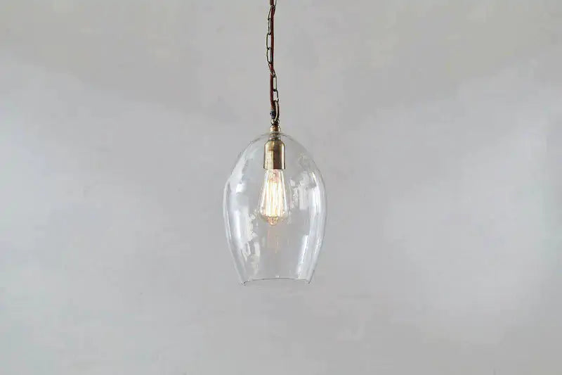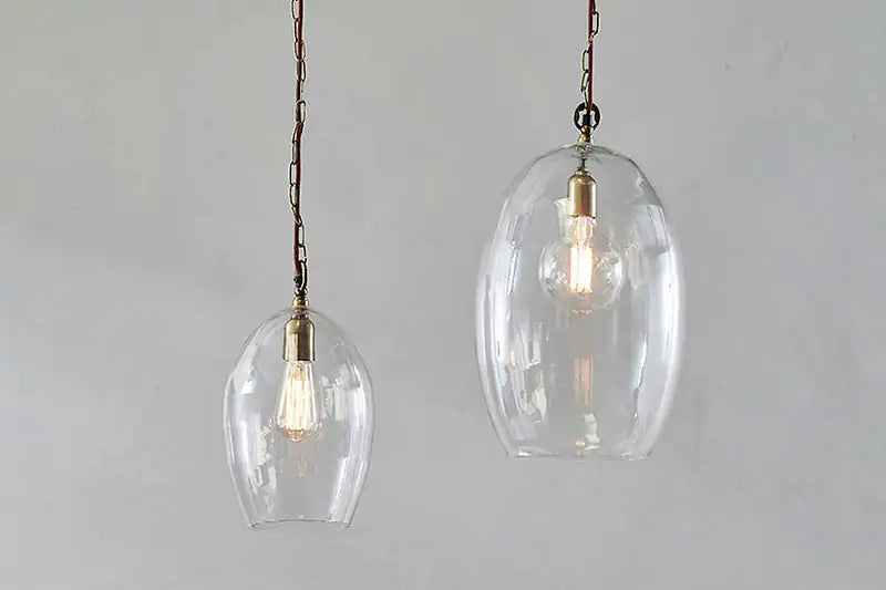 This small oval Opti pendant light has a beautifully crafted handmade feel. The organic shape of the recycled glass dome as an elegant oval shape. The small size of the pendant means it would work well in a three above a table or kitchen island. Equally it is well suited as a bedside light, hung either side of a bed. Available in two colours.