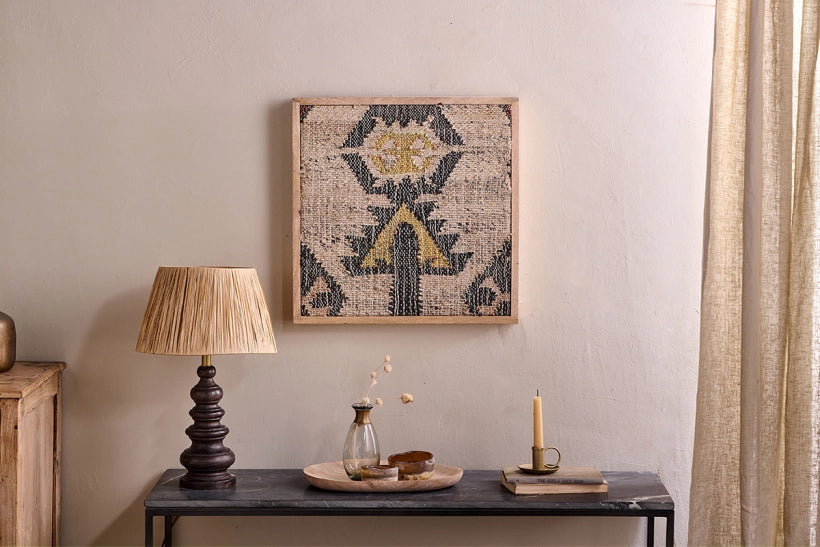 The striking kilim design of our Pachu artwork makes it a truly eye-catching addition to your home. Handwoven on a traditional loom using centuries-old techniques, the skill and experience of the artisans is clear. Kilim is a form of weaving typically found across eastern Europe and central Asia, which produces distinctive flat tapestries with beautiful geometric patterns. This artwork comes with a simple mango wood outer frame which allows the colours and details to really shine