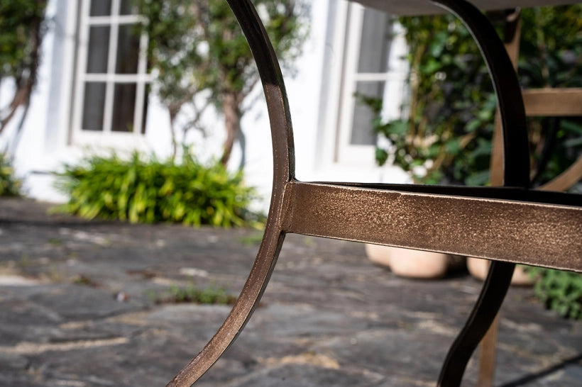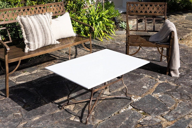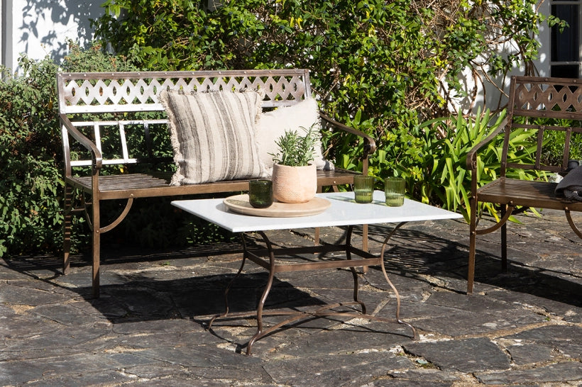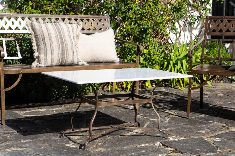 The Paha marble coffee table makes an elegant addition to any garden setting. The appealing off – white tones feel summery and light, blending effortlessly into an outdoor landscape. The smooth surface of the marble make it a pleasure to use. The elegant iron legs offer an interesting design detail as well as providing sturdy and enduring support. The Paha marble coffee table has a timeless look that is at home on a townhouse balcony as it is a country garden.