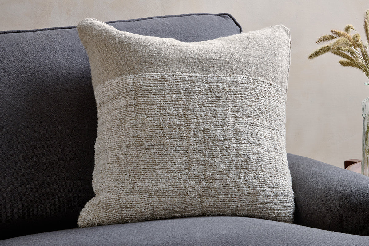 Our Papa recycled linen cushion covers are skillfully woven from the finest quality recycled hand-spun yarn. In timeless neutral tones of soft grey and off-white, these covers have an organic look, bringing an understated elegance to your living space. The relaxed, slubby texture of the linen feels both comfortable and casual, making it an excellent choice for any room. Linen is known for its breathability and durability, and we love its natural, unstructured aesthetic.