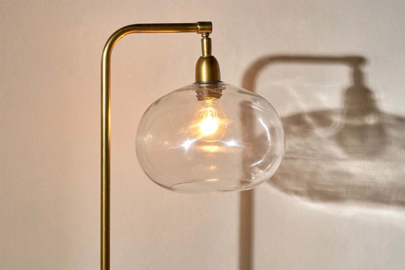 The stylish Qi glass floor lamp boasts an organically shaped glass shade and elegant antique brass stand. The stunning circular shade creates a unique feature, even when the lamp is switched off. However, when you do turn the lamp on, the warm brass of the circular base and single solid stem shines beautifully, making this a stunning piece.