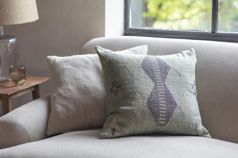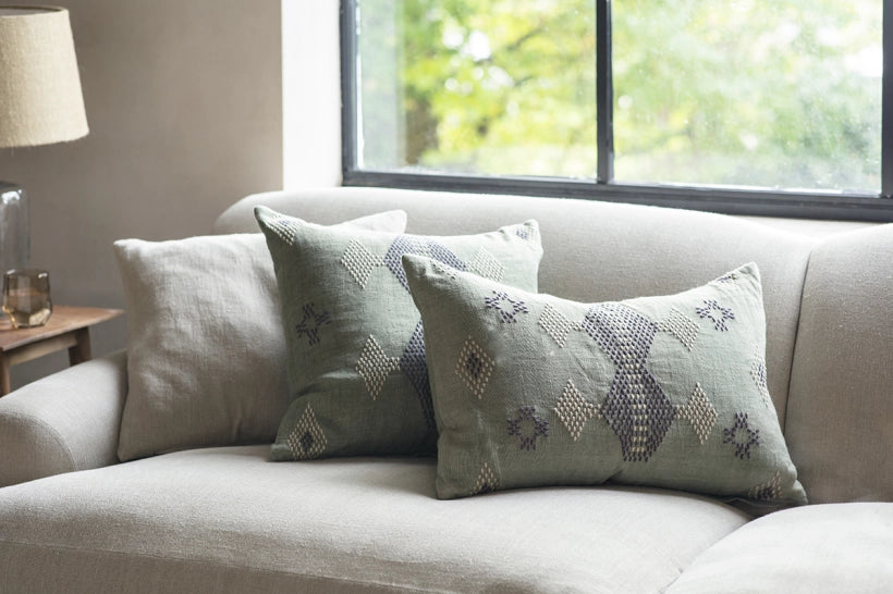The Serki embroidered linen cushion cover has a sublimely calming affect. The beautifully tactile linen base of each cushion cover, is skilfully embroidered with the attractive contrasting tones. The mix of subtle colour tones and soft linen is a match made in heaven. Style against a natural or dark back drop and bring a touch of spring to your home.