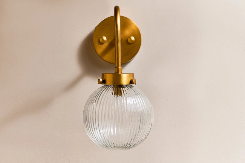 The Tope globe wall light is perfect for bringing warmth and light to a bathroom. The glass globe has an interesting ribbed finish, that helps to diffuse the light. The globe is set into a brass fixing which joins an elegant swan neck arm and brass wall fitting. This timeless, well – designed light would sit well either side of a mirror in a bathroom space. The clear glass and warm brass materials make the perfect pairing.