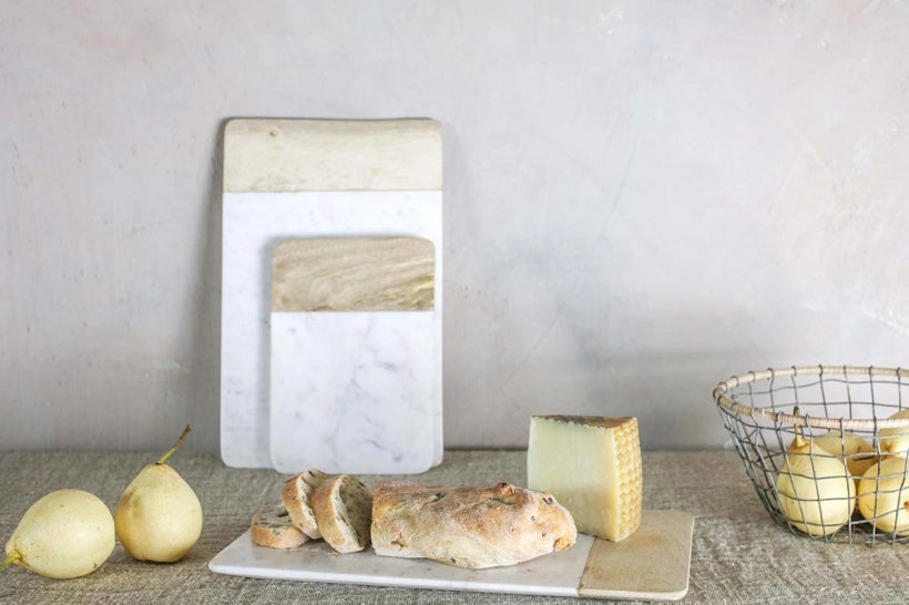 Our Yuum marble boards are made from smooth white marble, complemented with a natural mango wood segment. The piece is skilfully handmade using traditional tools. Designed for the kitchen and the table, they are ideal for serving anti-pasti and sharing foods and as chopping boards.